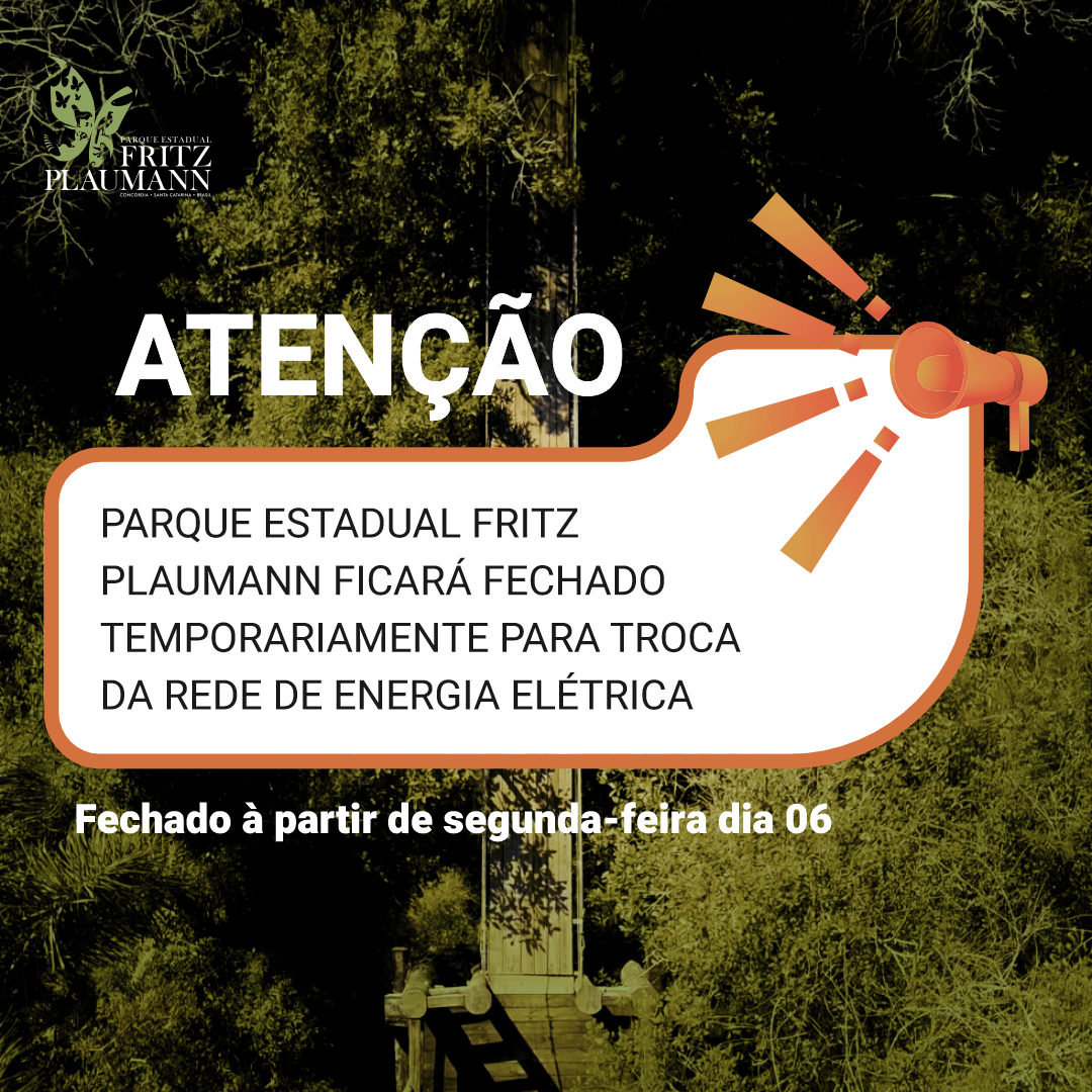 O Instituto do Meio Ambiente de Santa Catarina (IMA) informa que o Parque Estadual Fritz Plaumann (PAEFP) ficará fechado temporariamente para troca da rede de energia elétrica. A obra para instalação da energia subterrânea iniciará na próxima segunda-feira (06) e seguirá até sexta-feira (17), período em que o parque ficará fechado para visitação do público.…