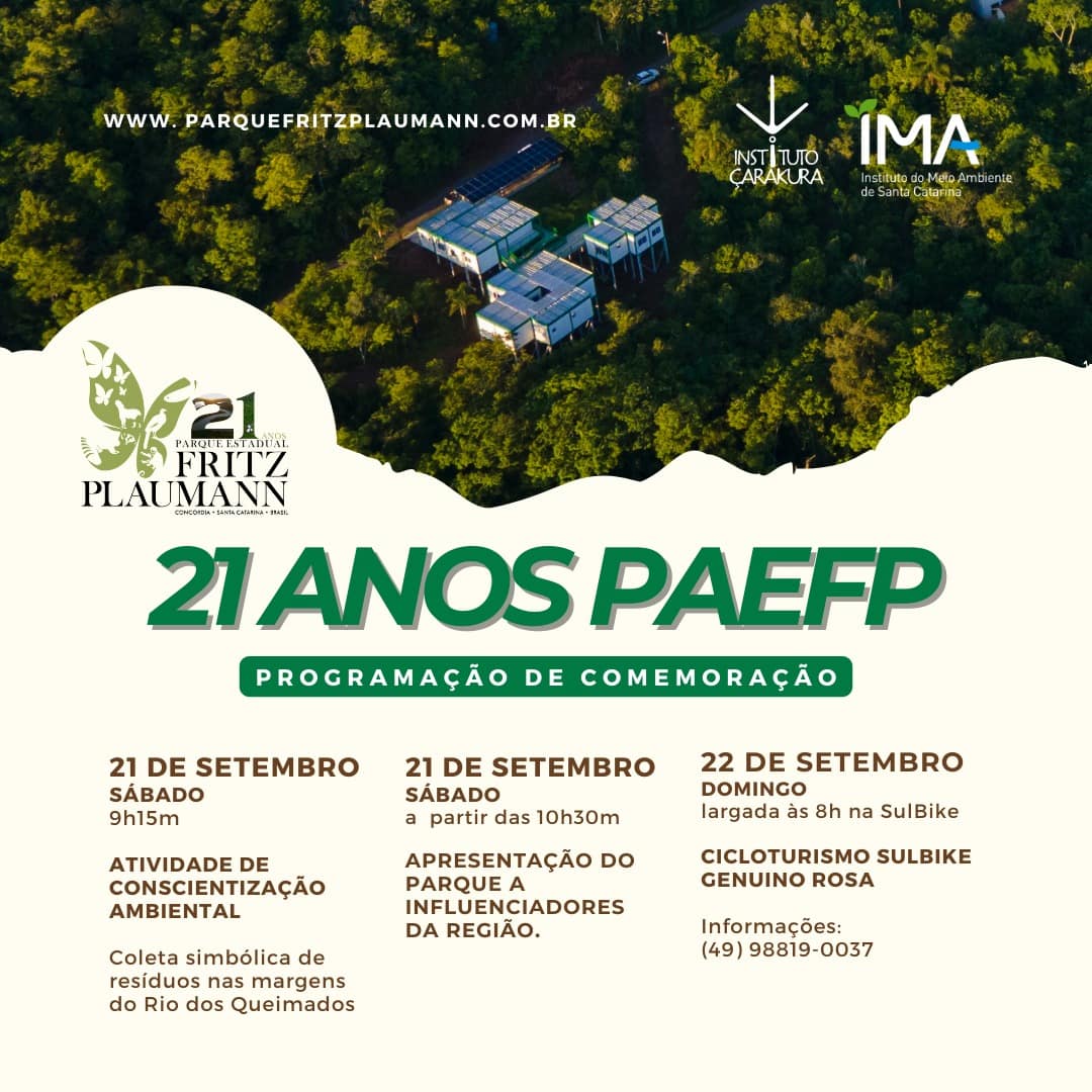 Leia mais A PROGRAMAÇÃO DOS 21 ANOS DO PARQUE ESTADUAL FRITZ PLAUMANN ESTÁ IMPERDÍVEL!