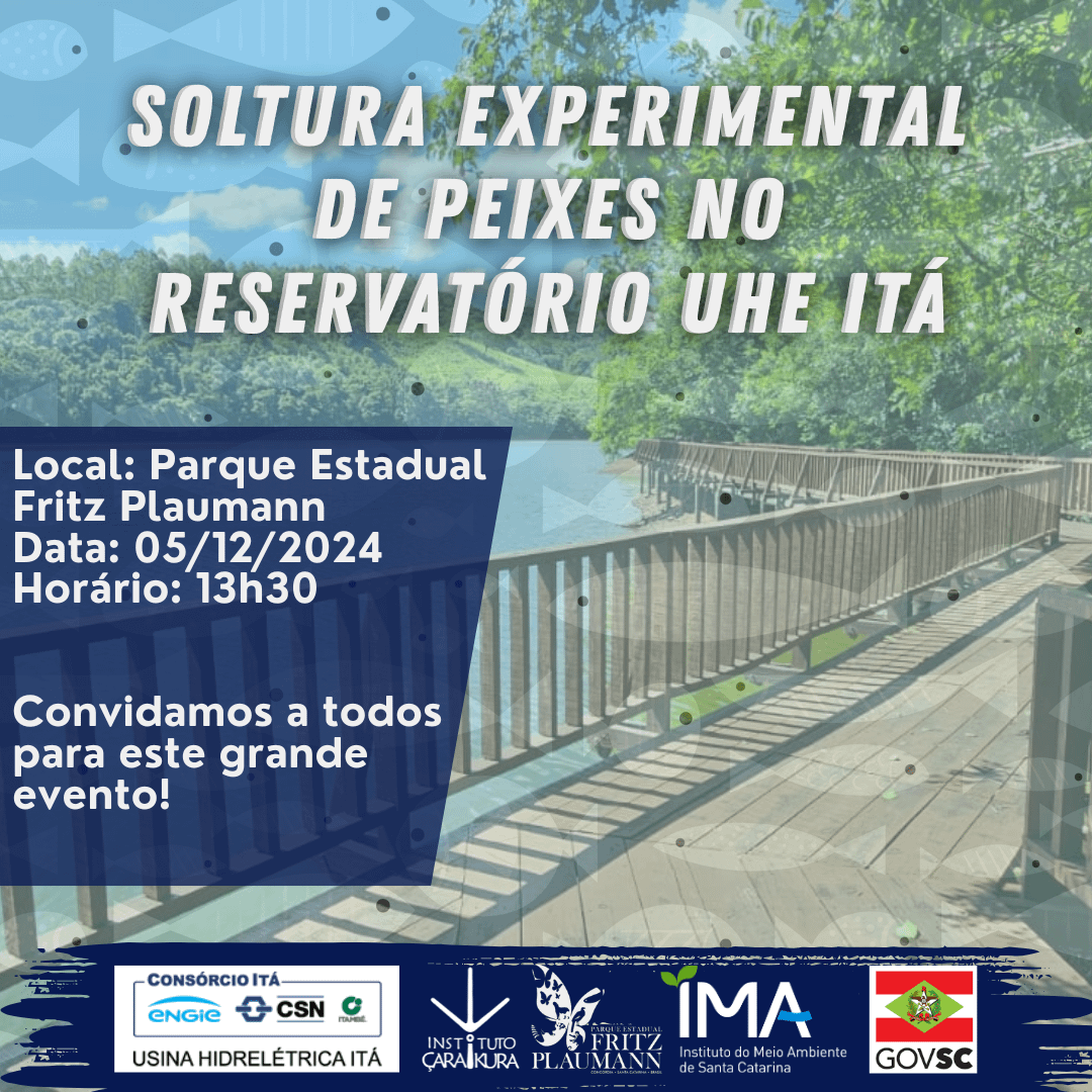 Soltura Experimental de Peixes na UHE Itá No dia 05 de dezembro de 2024, o Parque Estadual Fritz Plaumann (PAEFP) sediou o evento de Soltura Experimental de Peixes na Usina Hidrelétrica Itá (UHE Itá).A ação foi promovida pelo Consórcio Itá, em parceria com o LAPAD (Laboratório de Biologia e Cultivo de Peixes de Água Doce),…